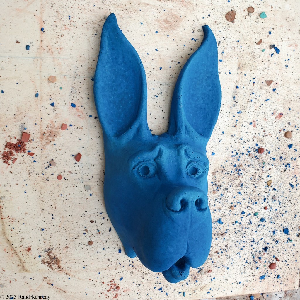 I had some extra cement after filling an order. It was either toss it or do something fun. This Dane is so blue he literally sheds it when I touch him. I had to stop work and go wash my hands after taking him out of the mold to stop smearing everything with blue smudges, including sculptures not intended to be blue.